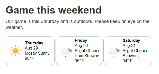 Weather base geographic targeting includes a configurable weather forecast, as shown below, for each recipient. This is especially useful for events or other activities where weather may impact the event.