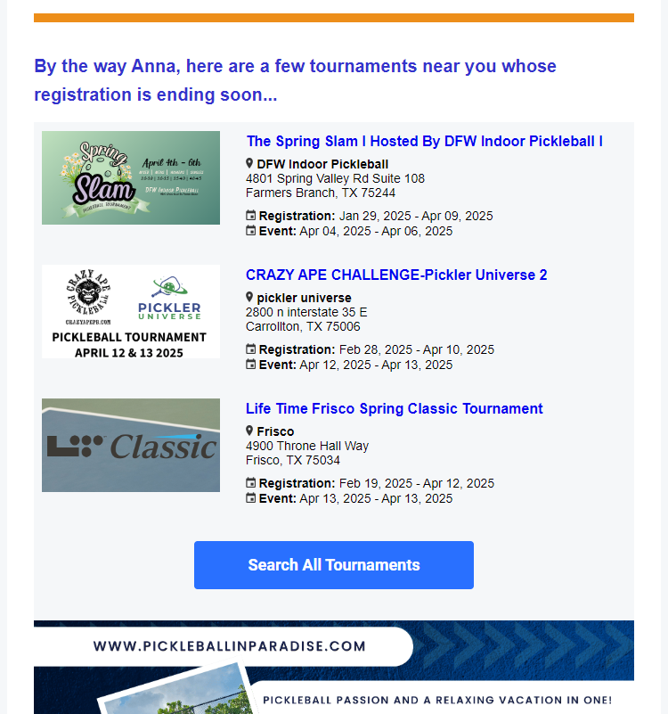 Pickleball.com maintains a database of Pickleball players across the world. They also manage and promote Pickleball events that take place around the world. Using DailyStory’s hyper local and personalized event targeting they send millions of emails per-month each with its own personalized list of upcoming Pickleball events.